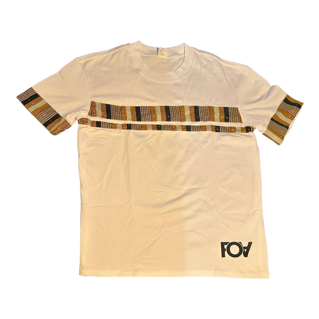 Light beige T-shirt with unique tribal-inspired sleeve details.